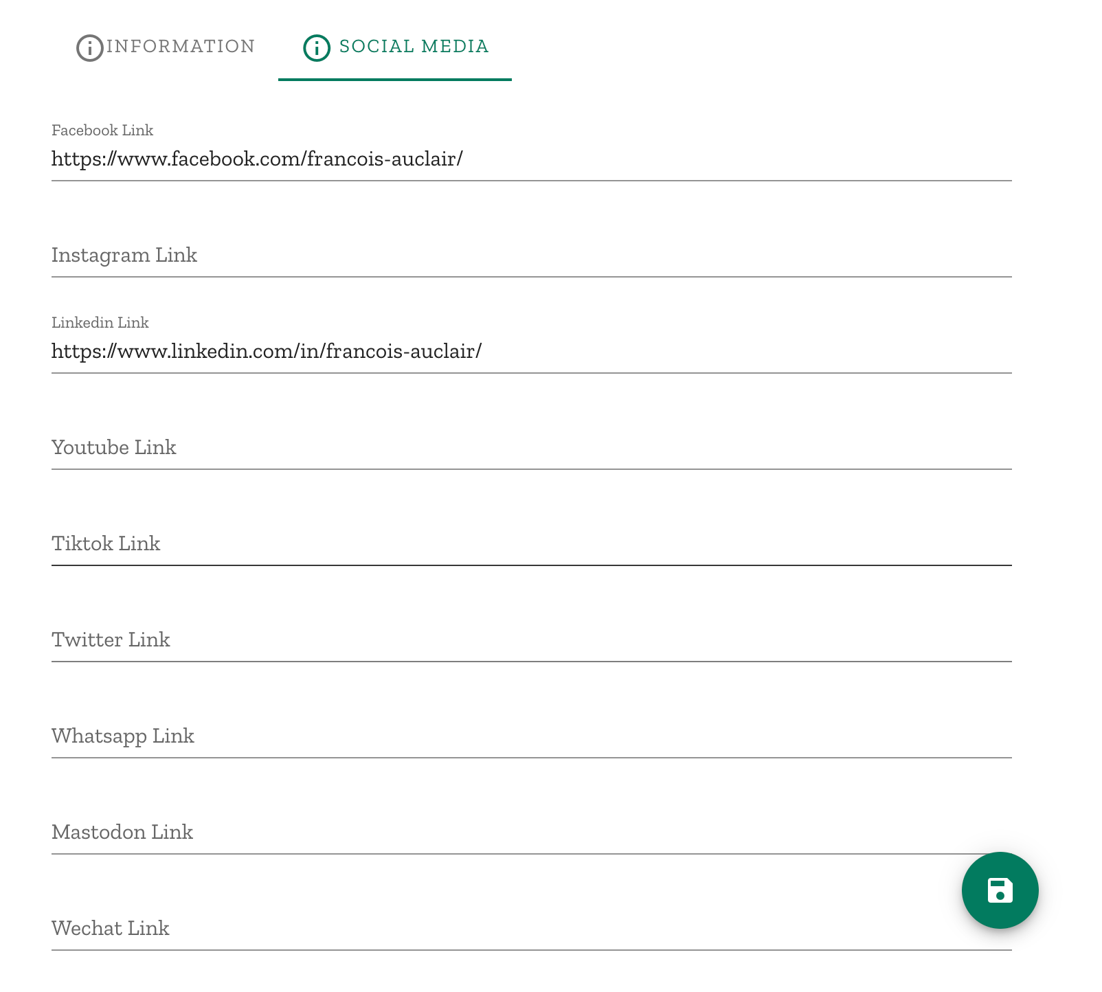Every field is optional, whenever a field is filled the related social link will be displayed on your profile